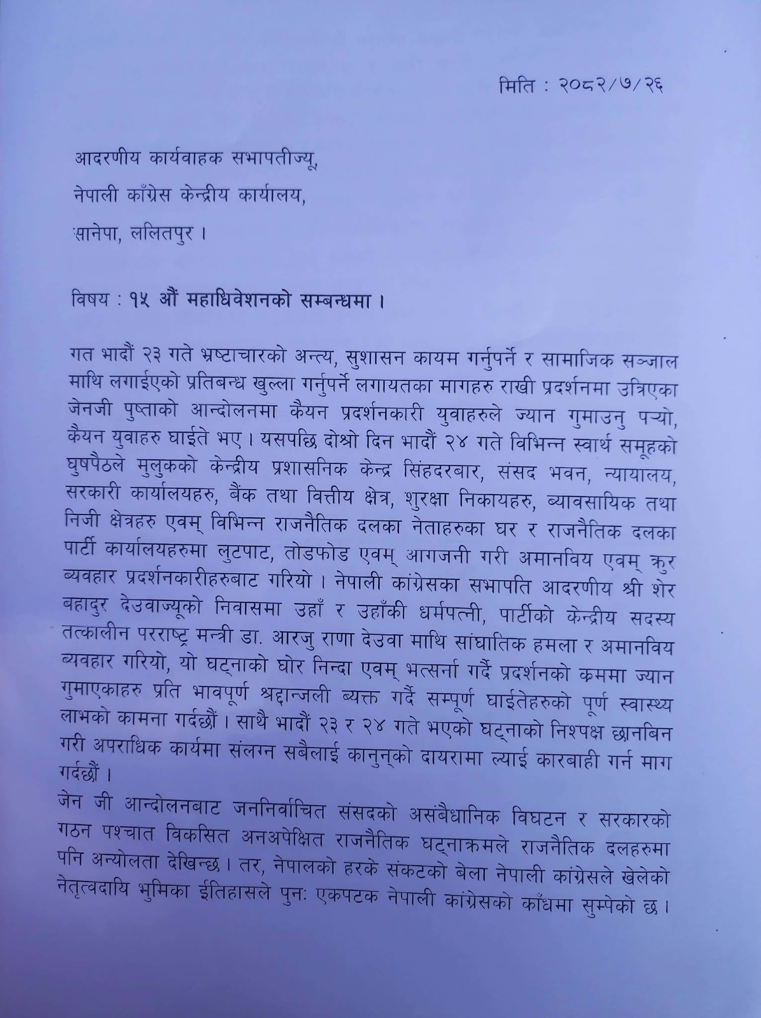 ‘आसन्न २०८२ साल फागुन २१ गतेको निर्वाचनलाई परिणाममुखी बनाउन पार्टीको विधान बमोजिम २०८२ साल मङ्सिर महिनाभित्र १५ औँ महाधिवेशन प्रारम्भ गरी तहगत रूपमा अधिवेशन सम्पन्न गर्नका लागि कार्यतालिका बनाई लागू गर्ने,’ ज्ञापनपत्रमा भनिएकाे छ।