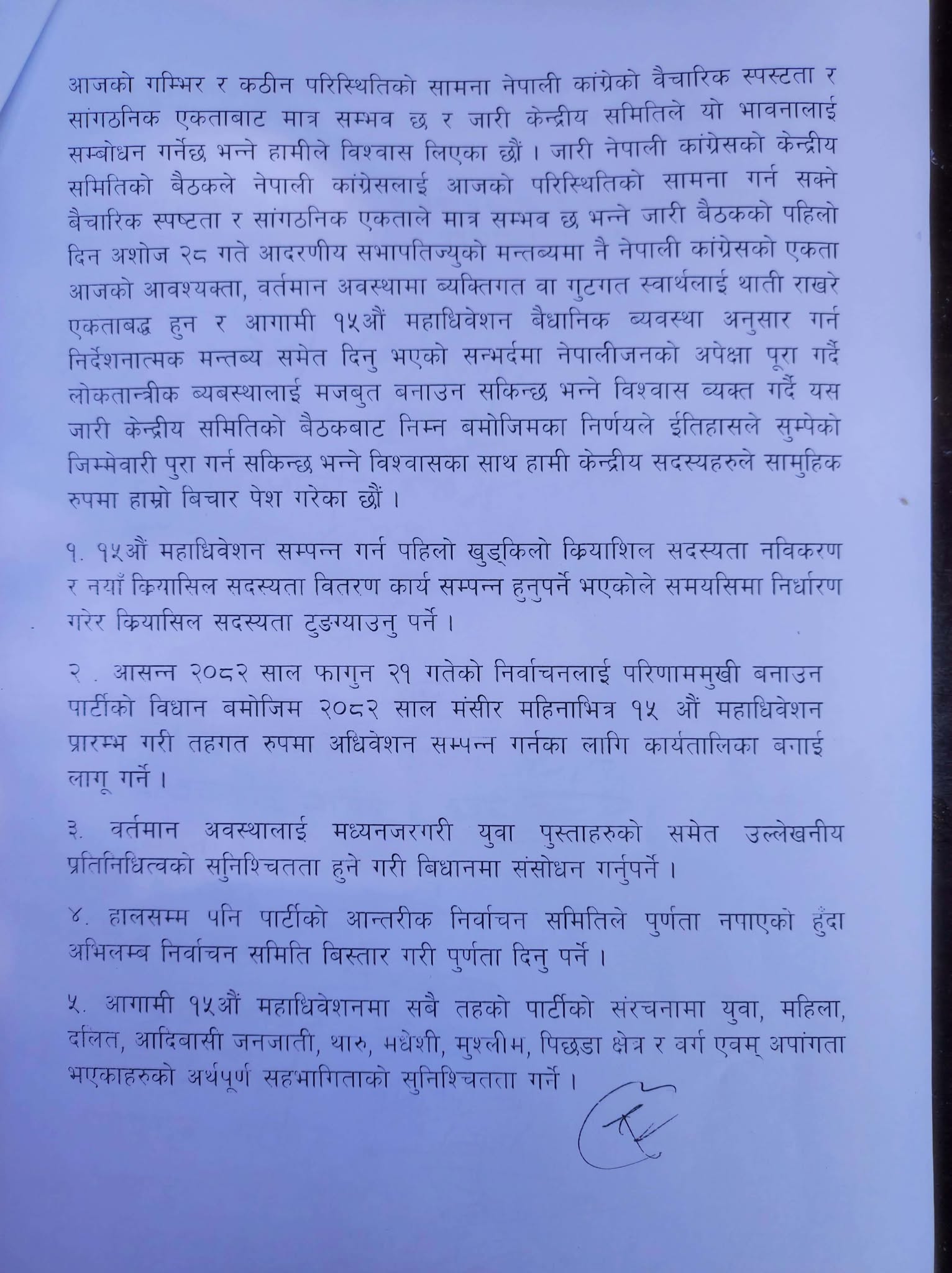 काठमाडौँ। नेपाली कांग्रेसको संस्थापन पक्षका २४ केन्द्रीय सदस्यले फागुन २१ गतेकाे निर्वाचनअघि नै पार्टीको १५औँ महाधिवेशन सम्पन्न गर्न माग गरेका छन्।
