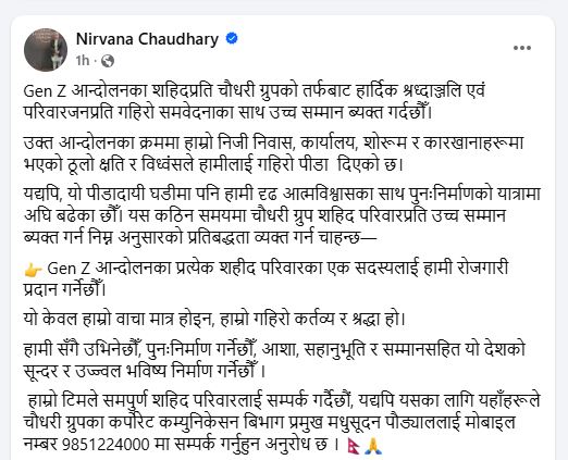 ‘जेनजी आन्दोलनका प्रत्येक शहीद परिवारका एक सदस्यलाई हामी रोजगारी प्रदान गर्ने छौं,’ सीजीका प्रबन्ध निर्देशक चौधरीले लेखेका छन्, ‘यो केवल हाम्रो वाचामात्र होइन, हाम्रो गहिरो कर्तव्य र श्रद्धा हो । हामी सँगै उभिने छौं, पुनर्निर्माण गर्ने छौं, आशा, सहानुभूति र सम्मान सहित यो देशको सुन्दर र उज्ज्वल भविष्य निर्माण गर्ने छौं ।’
