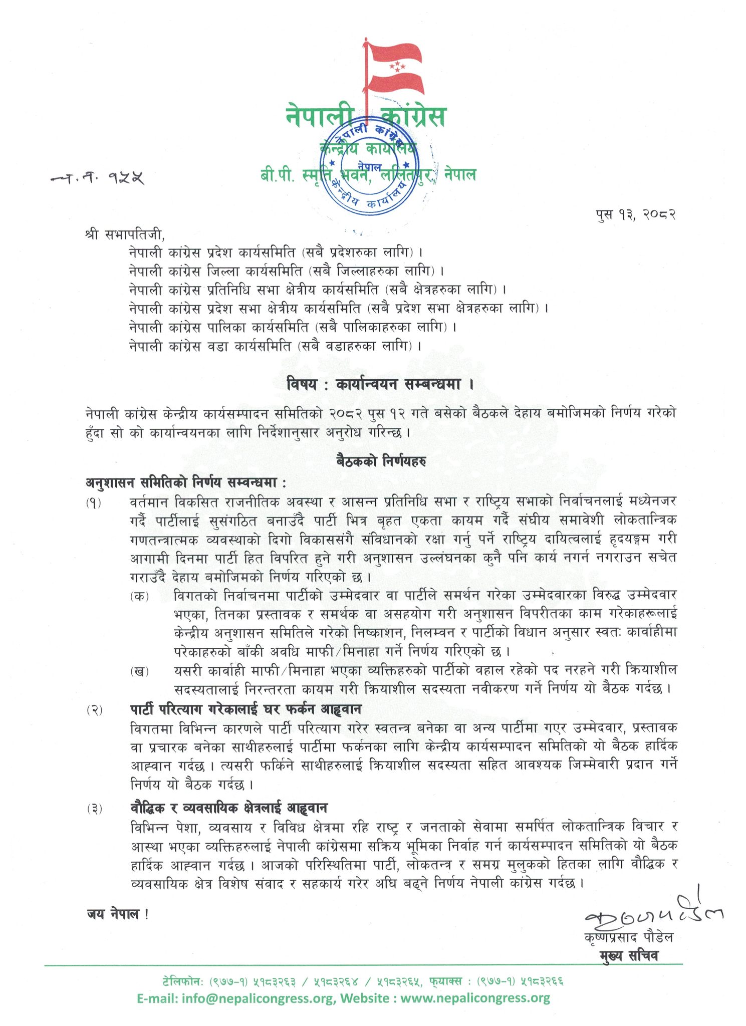 कांग्रेसले आज एक विज्ञप्तिमार्फत पार्टीका सबै प्रदेश, जिल्ला, प्रतिनिधिसभा र प्रदेश क्षेत्रीय कार्यसमिति, पालिका कार्यसमिति र वडा कार्यसमितिलाई सम्बोधन गरी उक्त निर्णय कार्यान्वयन गर्न निर्देशन जारी गरेको हो।