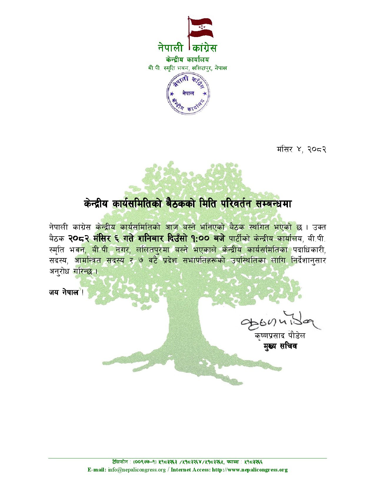 ‘केन्द्रीय कार्यसमितिको बैठकको मिति परिवर्तन सम्बन्धमा नेपाली कांग्रेस केन्द्रीय कार्यसमितिको आज बस्ने भनिएको बैठक स्थगत भएको छ। उक्त बैठक २०८२ मंसिर ६ गते शनिबार दिउँसो १:०० बजे पार्टीको केन्द्रीय कार्यालय, बी. पी. स्मृति भवन, बीपी नगर, ललितपुरमा बस्ने भएकाले केन्द्रीय कार्यसमितिका पदाधिकारी, सदस्य, आमन्त्रित सदस्य र ७ वटै प्रदेश सभापतिहरूको उपस्थितिका लागि निर्देशानुसार अनुरोध गरिन्छ’, पौडेलद्वारा जारी विज्ञप्तिमा भनिएकाे छ।