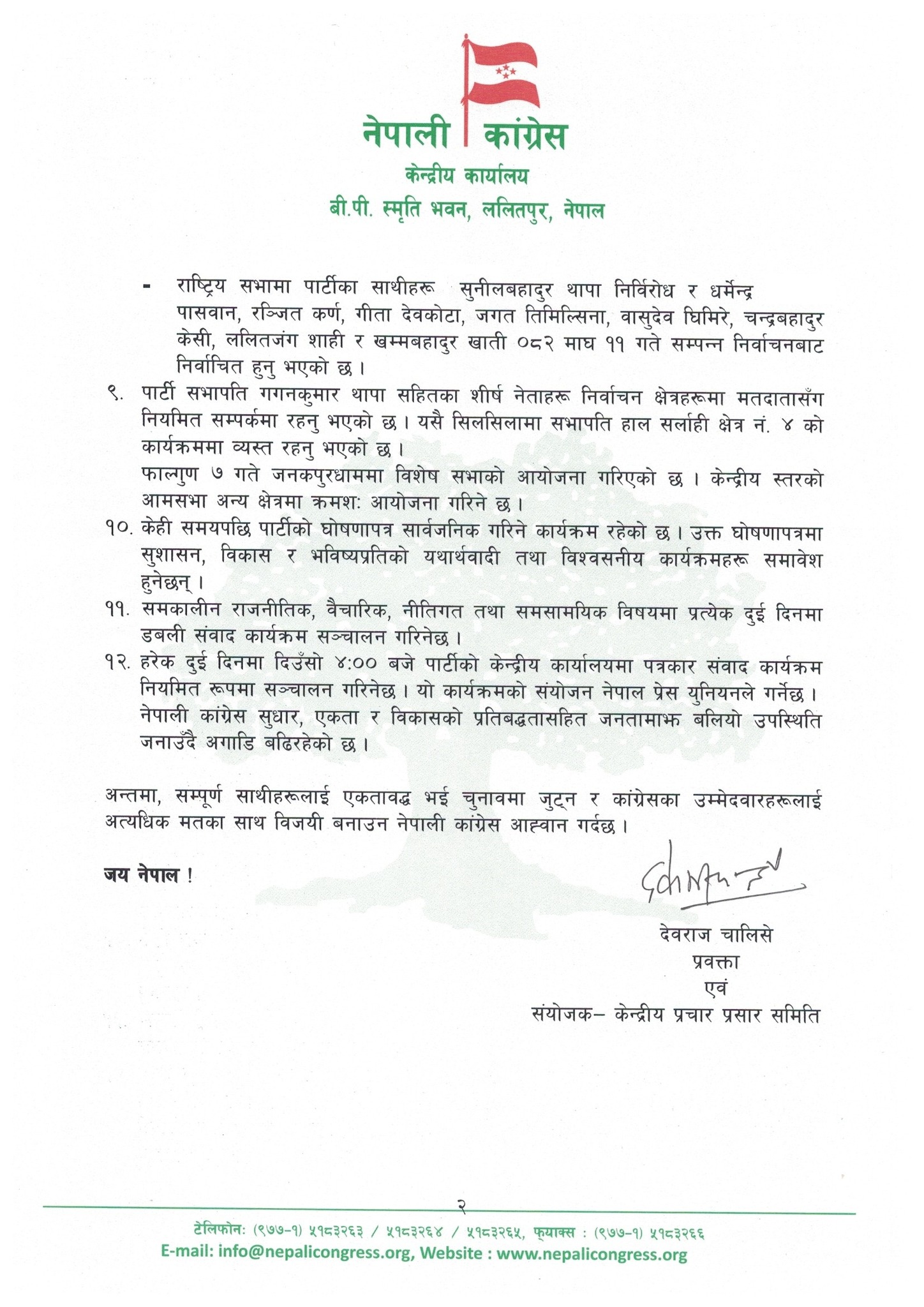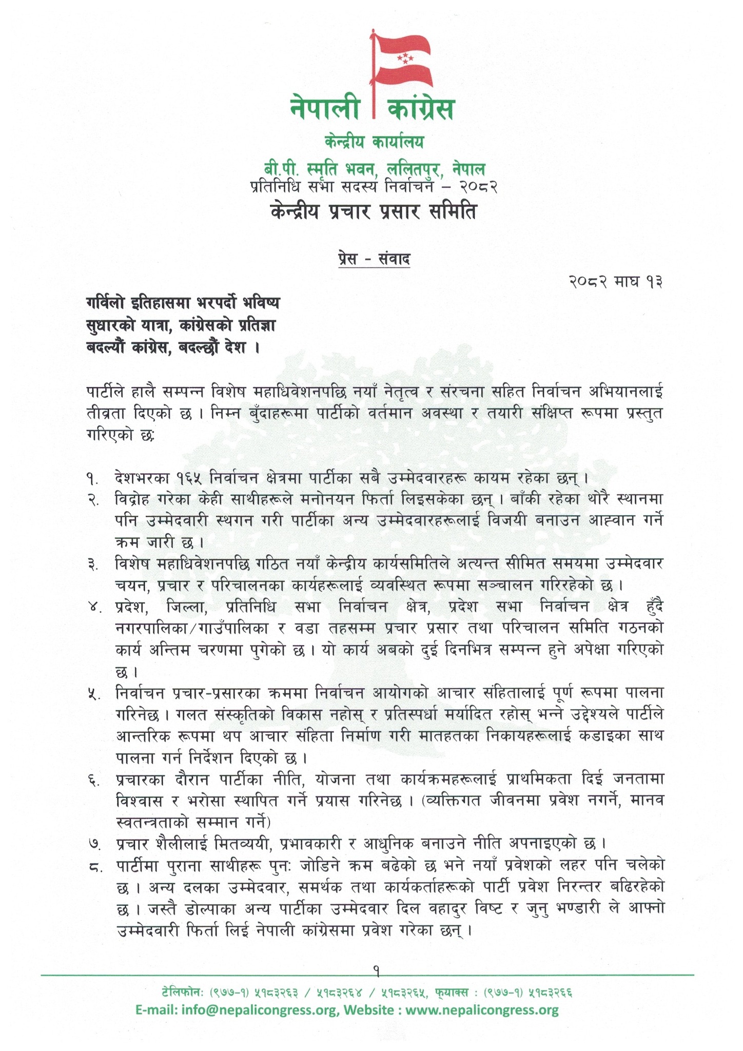 प्रतिनिधिसभा निर्वाचनका सम्बन्धमा मंगलबार केन्द्रीय कार्यालय सानेपामा पत्रकार सम्मेलन गरी कांग्रेसले यसबारे जानकारी गराएको हो।