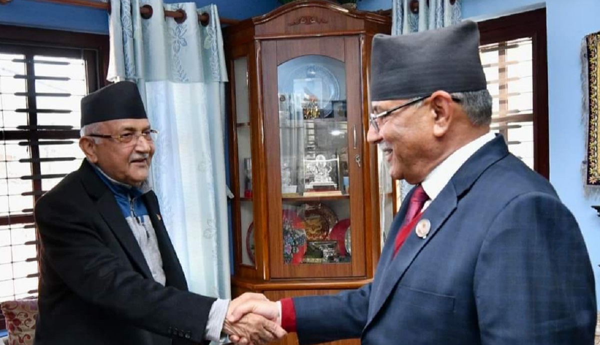 काठमाडाैँ। नेकपा एमालेका अध्यक्ष केपी शर्मा ओली र नेपाली कम्युनिस्ट पार्टी (नेकपा)का संयोजक पुष्पकमल दाहाल ‘प्रचण्ड’बीच भेटवार्ता भएकाे छ।