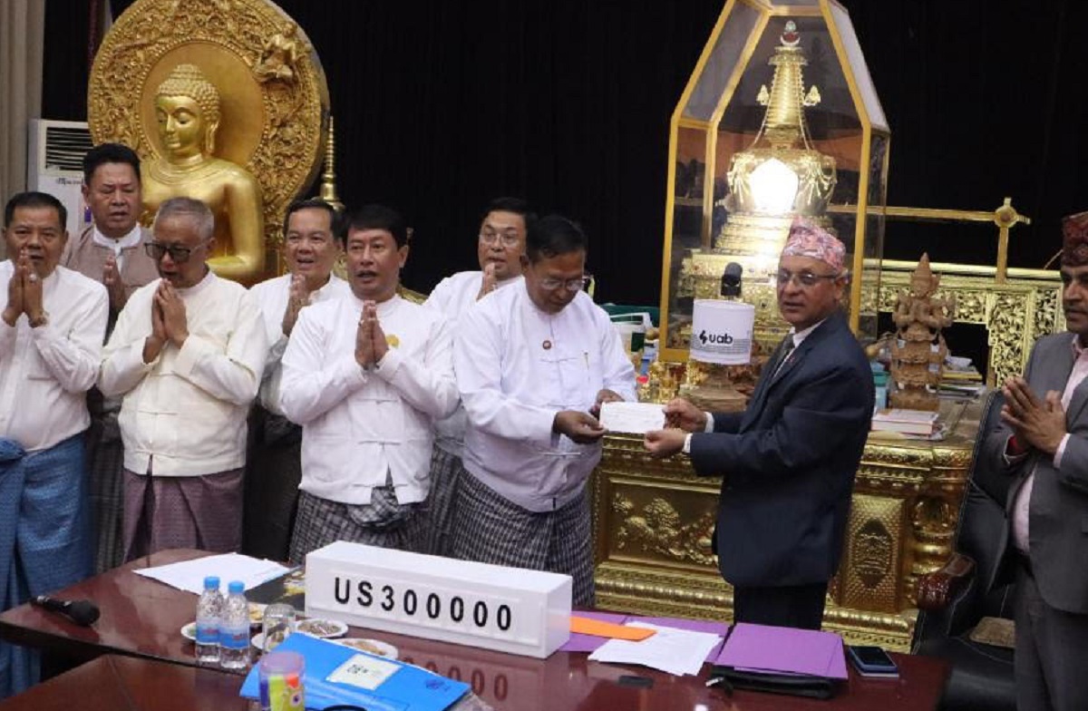 म्यान्मारका लागि नेपालका राजदूत हरिश्चन्द्र घिमिरेले म्यान्मारको मण्डले सहरको दक्षिण–पश्चिम क्षेत्रमा अवस्थित महामुनी पगोडा परिसरमा हालै आयोजित समारोहमा पगोडाका महासचिव थान उलाई तीन लाख अमेरिकी डलरको चेक हस्तान्तरण गरेको याङ्गुनस्थित नेपालको राजदूतावासले जनाएको छ।