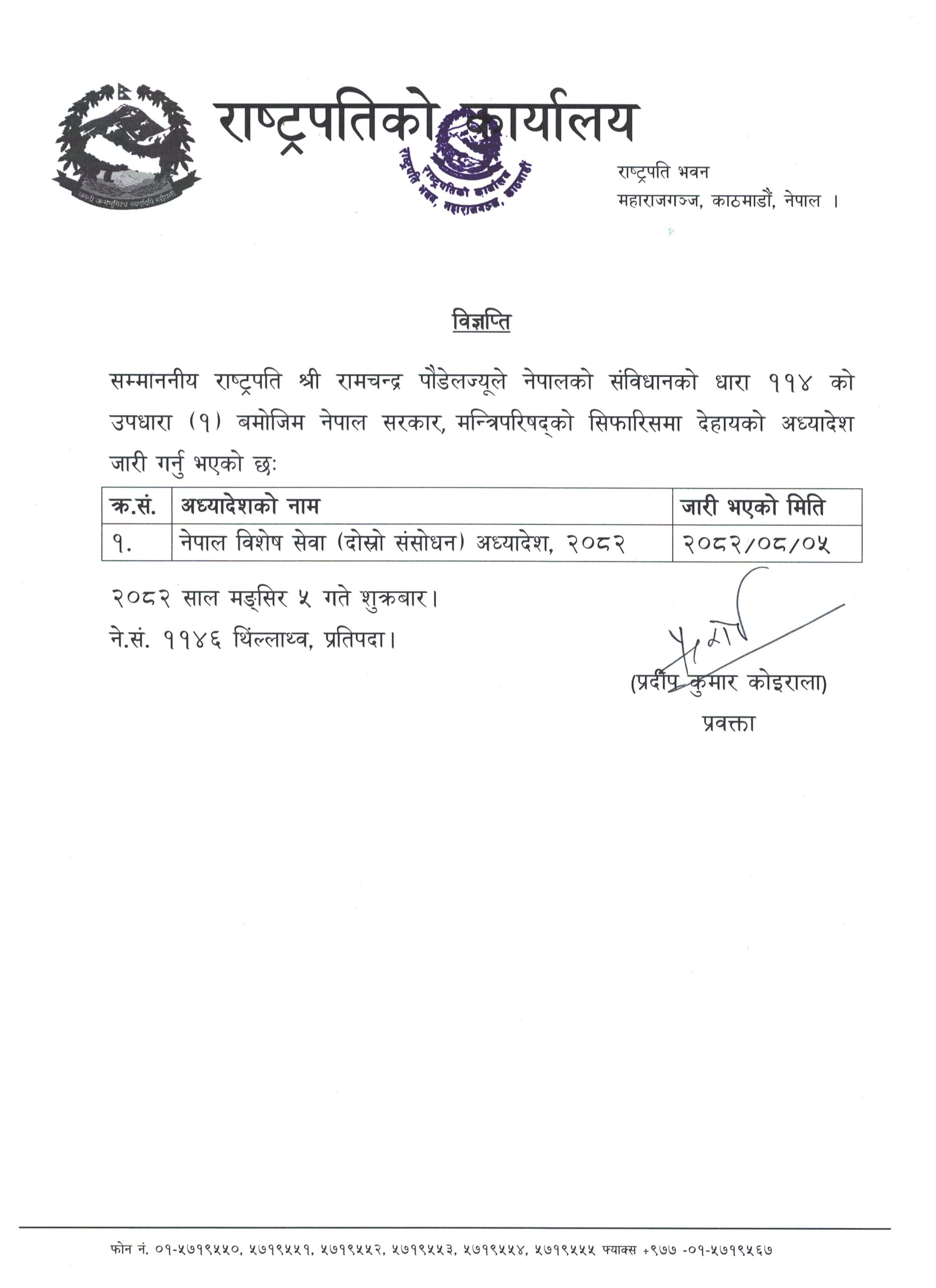 मन्त्रिपरिषद्को सिफारिसलाई ‘नेपाल विशेष सेवा ऐन २०४२ लाई संशोधन गर्न बनेको अध्यादेश’ राष्ट्रपति पौडेलले जारी गरेको राष्ट्रपतिको कार्यालयले जनाएको छ।