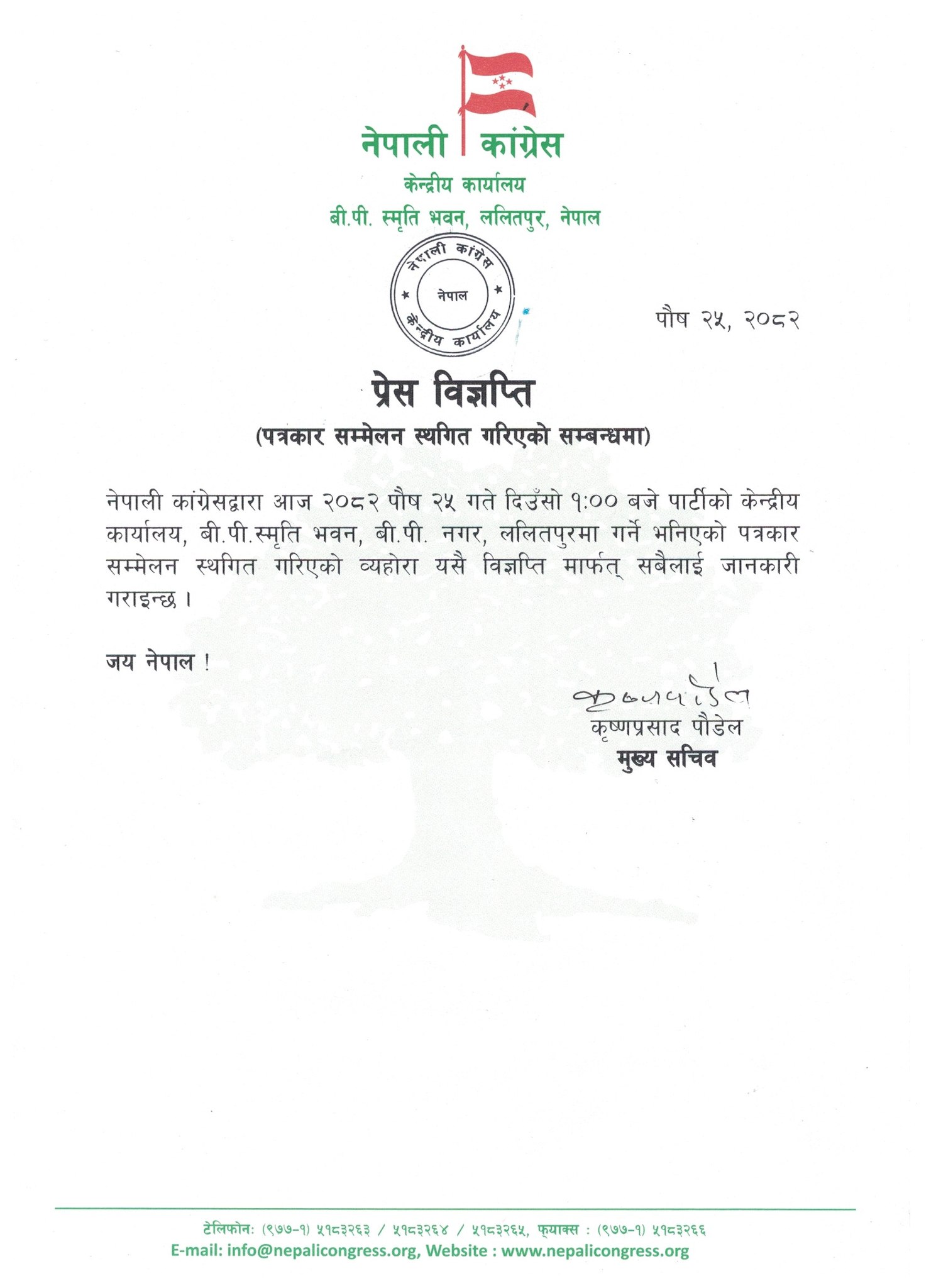 पार्टी केन्द्रीय कार्यालय सानेपामा दिउँसो १ बजे पत्रकार सम्मेलन आयोजना गरिएको जानकारी मुख्यसचिव कृष्णप्रसाद पौडेलले सार्वजनिक गरेका थिए तर मुख्य सचिव पौडेलले नै अर्को सूचना पठाएर सो पत्रकार सम्मेलन स्थगित गरिएको जनाएका छन् ।