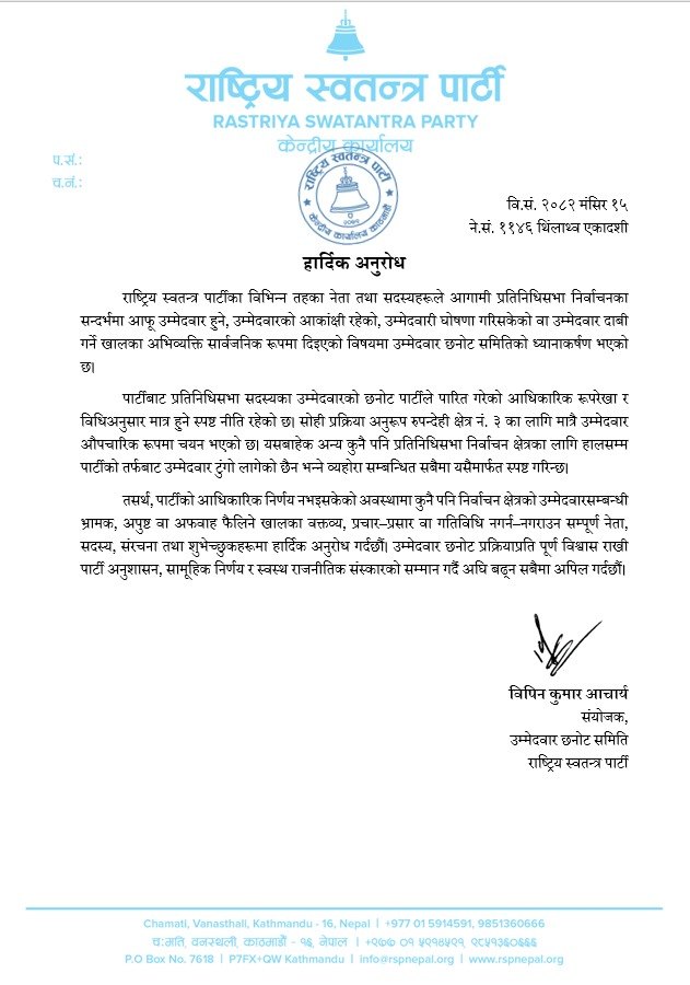पत्रमा थप भनिएकाे छ, ‘पार्टीको आधिकारिक निर्णय नभइसकेको अवस्थामा कुनै पनि निर्वाचन क्षेत्रको उम्मेदवारसम्बन्धी भ्रामक, अपुष्ट वा अफवाह फैलिने खालका वक्तव्य, प्रचार–प्रसार वा गतिविधि नगर्न–नगराउन सम्पूर्ण नेता, सदस्य, संरचना तथा शुभेच्छुकहरूमा हार्दिक अनुरोध गर्दछौं। उम्मेदवार छनोट प्रक्रियाप्रति पूर्ण विश्वास राखी पार्टी अनुशासन, सामूहिक निर्णय र स्वस्थ राजनीतिक संस्कारको सम्मान गर्दै अघि बढ्न सबैमा अपिल गर्दछौं।’