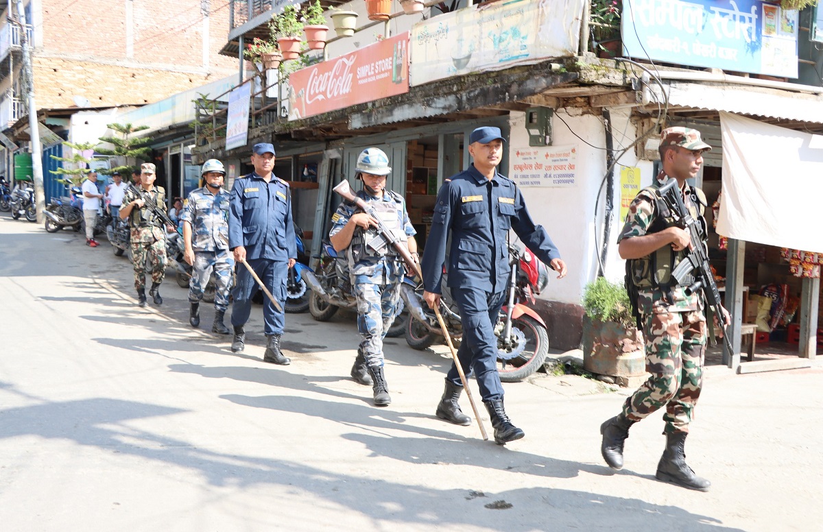 नेपाली सेना, सशस्त्र प्रहरी बल र नेपाल प्रहरीले जिल्लाका मुख्य बजार क्षेत्रहरूमा एकसाथ पैदल तथा मोबाइल गस्ती थालेका हुन्।