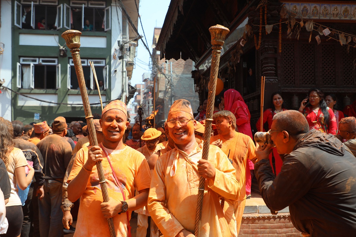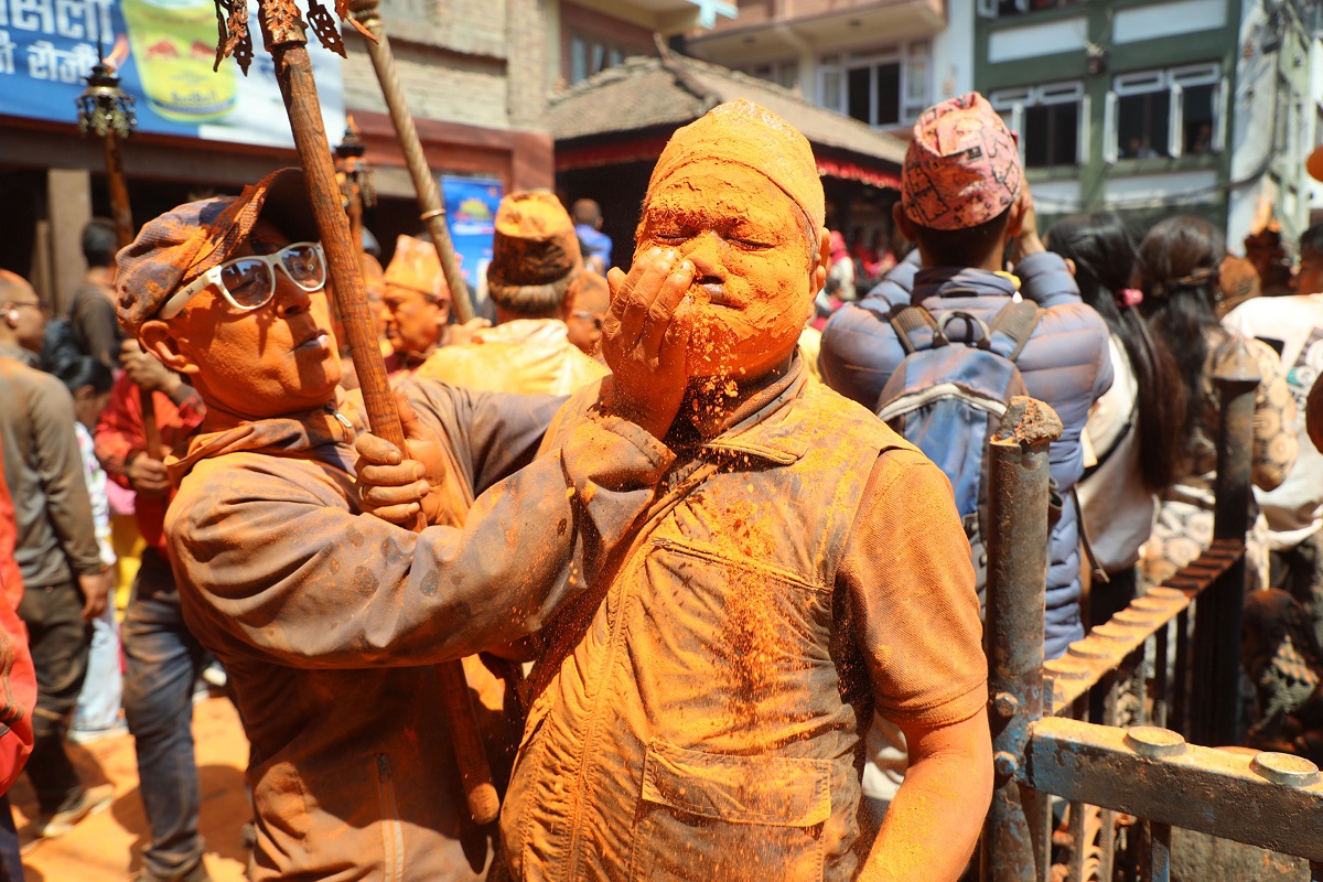 भक्तपुर । मध्यपुर थिमिमा हरेक वर्ष मनाइने बिस्काः जात्रा अन्तर्गत बुधबार बिहानको जात्रामा सिन्दुर खेलेर रमाउदै स्थानीय।