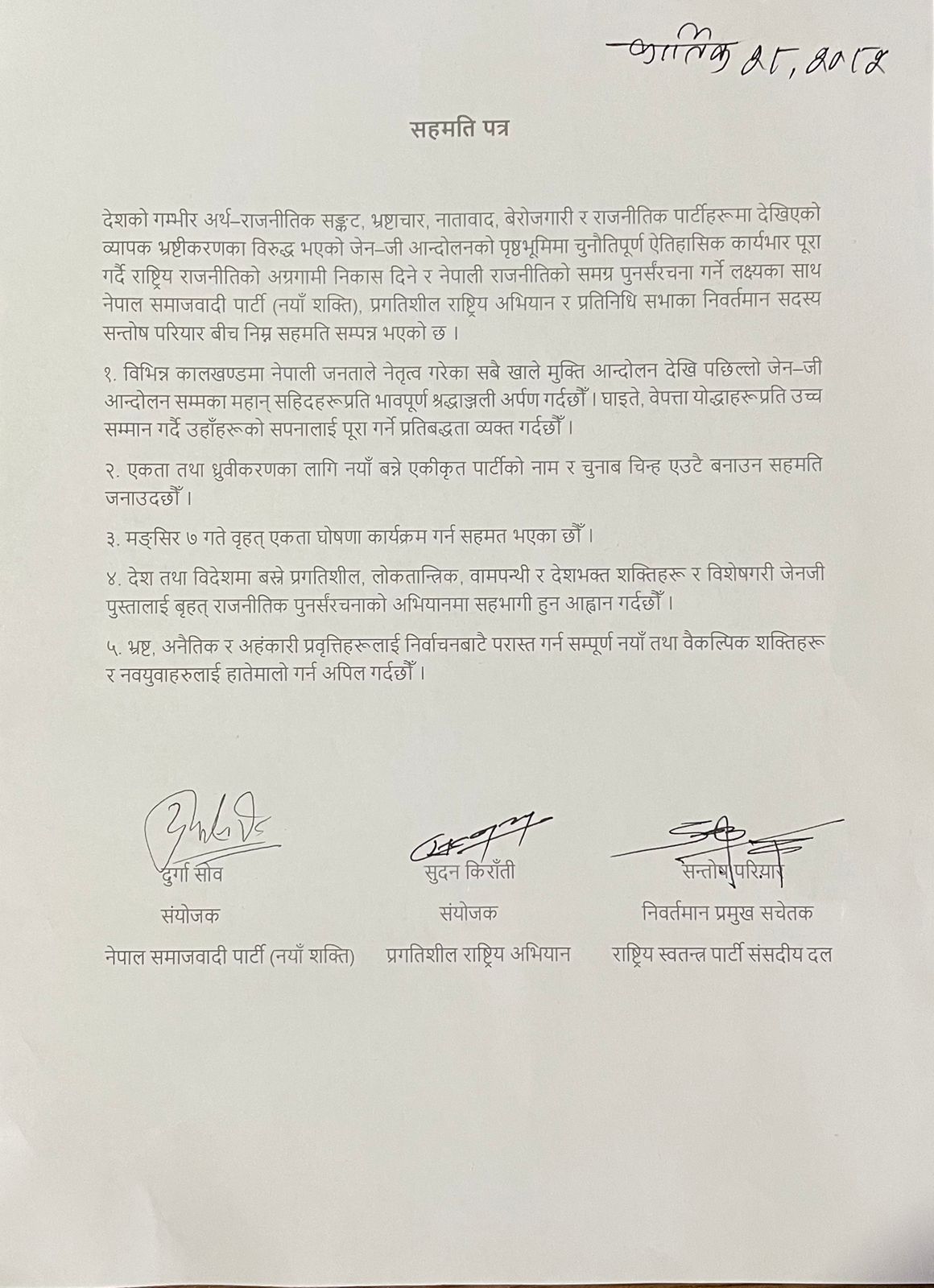 काठमाडौँ। राष्ट्रिय स्वतन्त्र पार्टी (रास्वपा) छाडेका सन्तोष परियार, प्रगतिशील राष्ट्रिय अभियानका संयाेजक सुदन किराँती र नेपाल समाजवादी पार्टी(नयाँ शक्ति)की संयोजक दुर्गा सोवबीच ५ बुँदे सहमति भएको छ।
