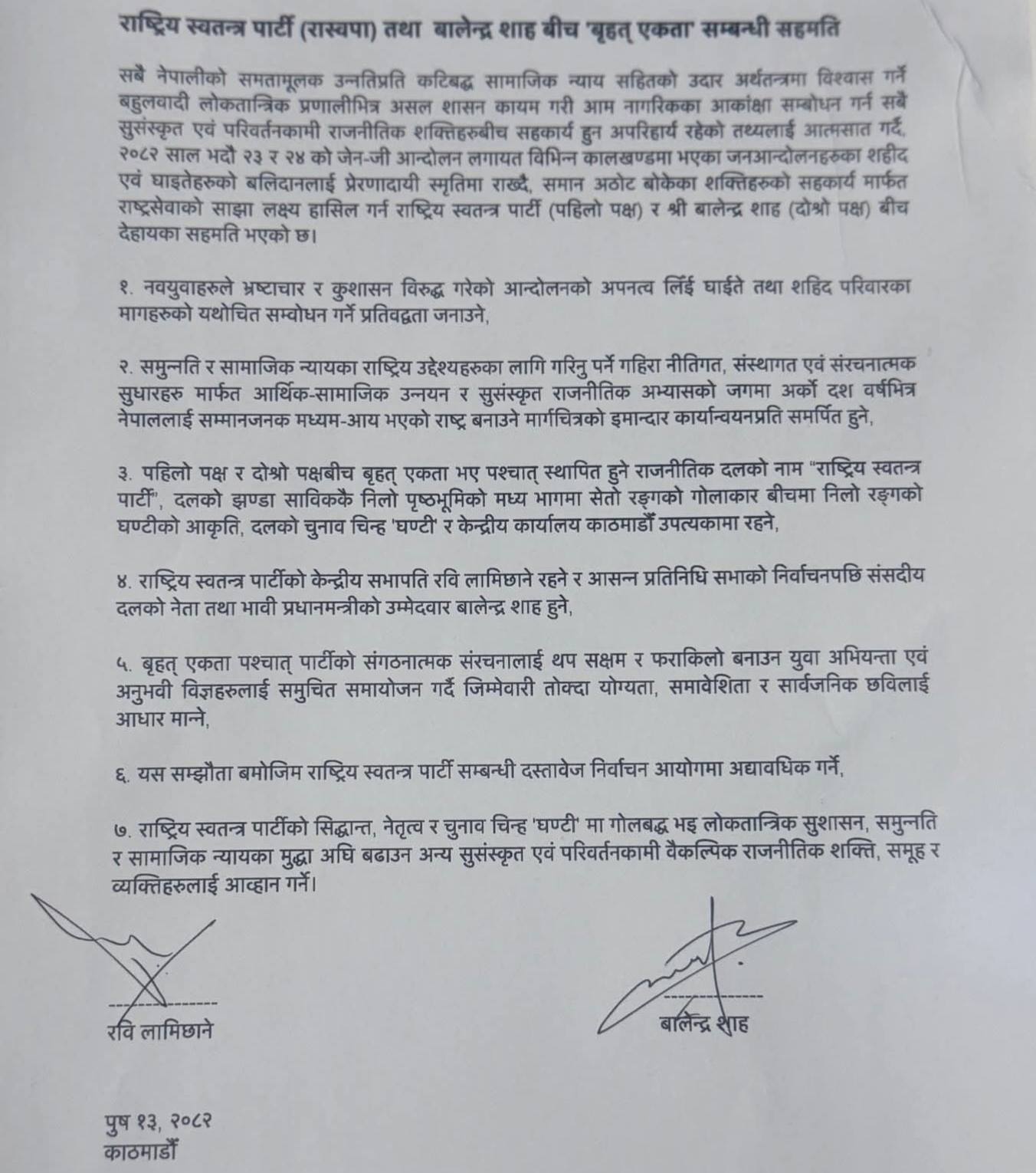 काठमाडौँ। राष्ट्रिय स्वतन्त्र पार्टी (रास्वपा) र काठमाडौँ महानगरपालिकाका प्रमुख बालेन्द्र (बालेन) शाहबीच विभिन्न विषयमा सात बुँदे सहमति भएको छ।