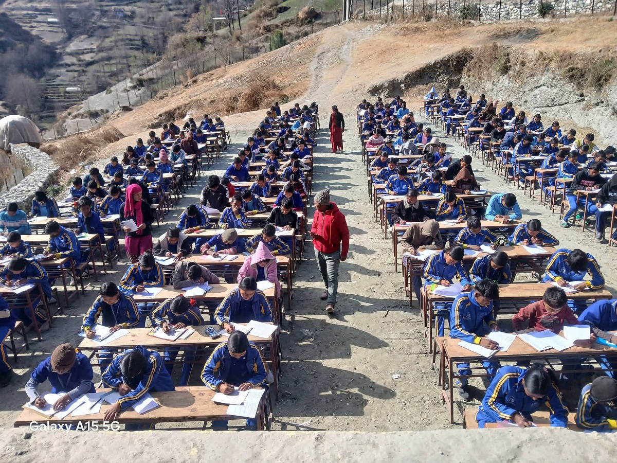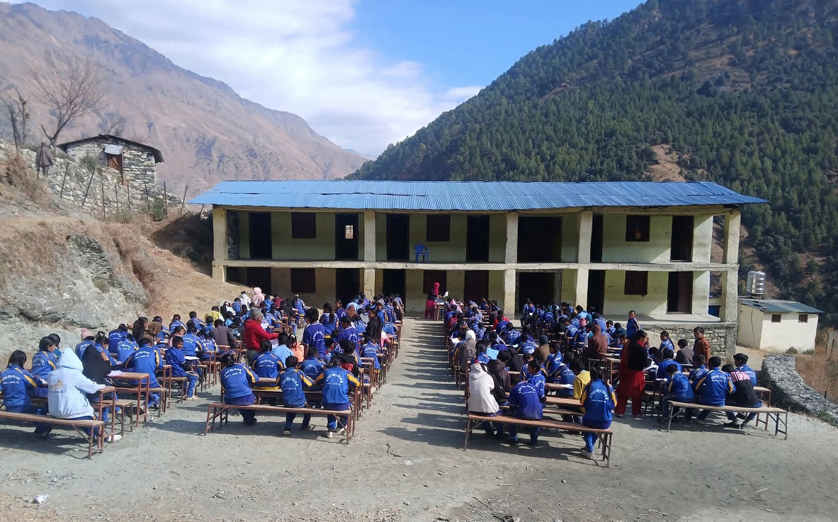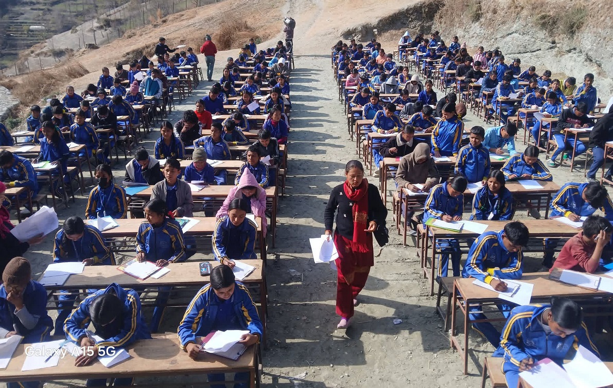 मुगुको छायाँनाथ रारा नगरपालिका–१ श्रीनगर गाउँस्थित श्री नेपाल राष्ट्रिय मीन माध्यमिक विद्यालयका विद्यार्थी कक्षाकोठा बाहिर घाम तापेर परीक्षा दिँदै ।